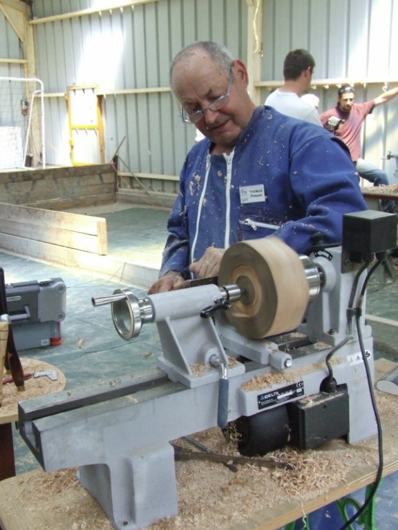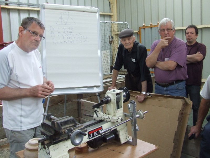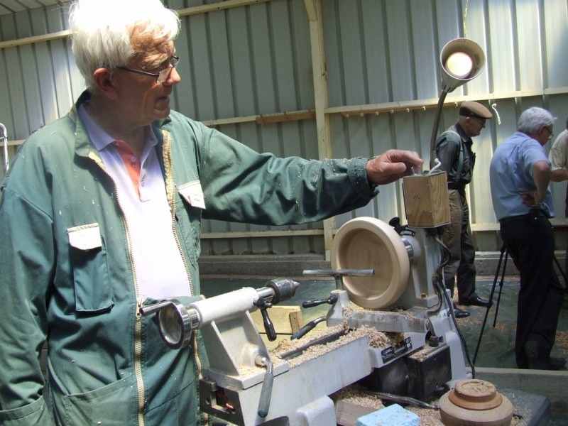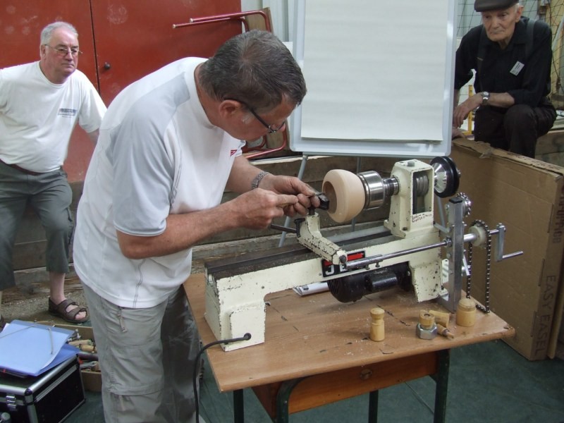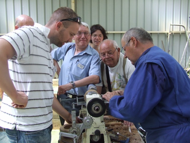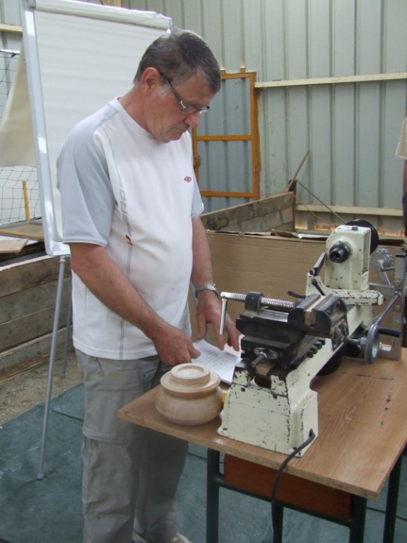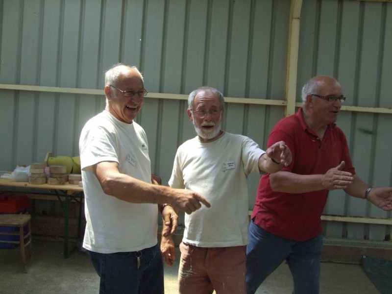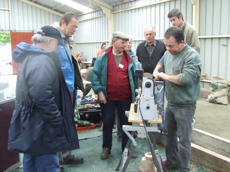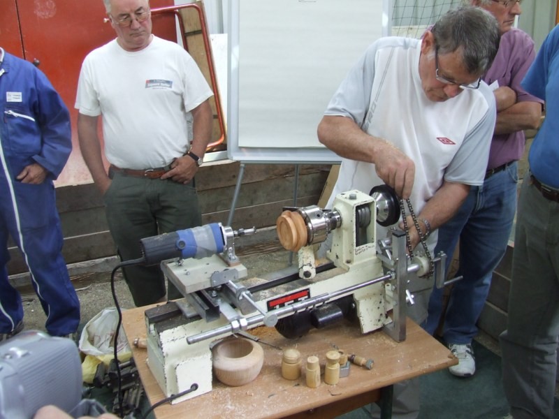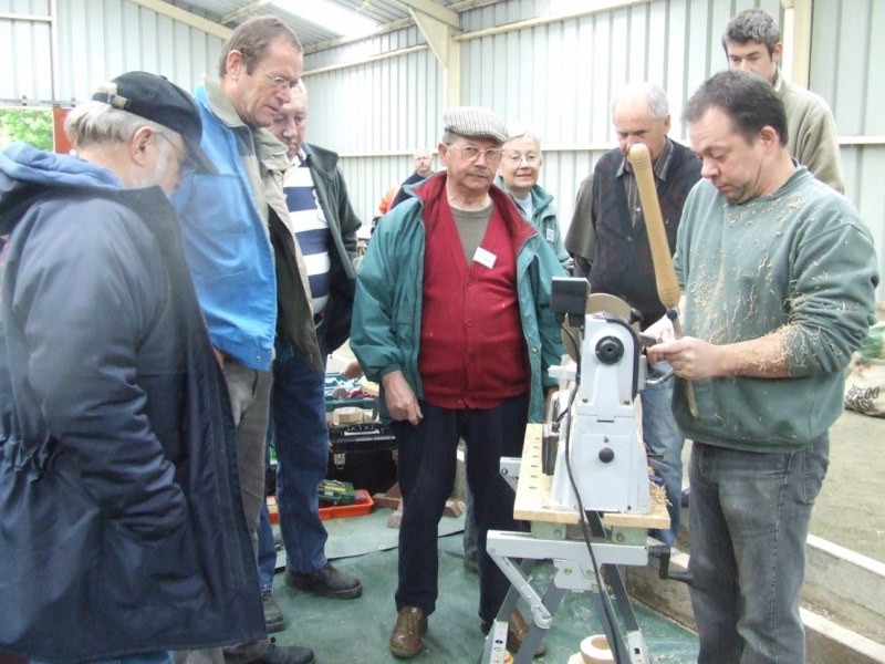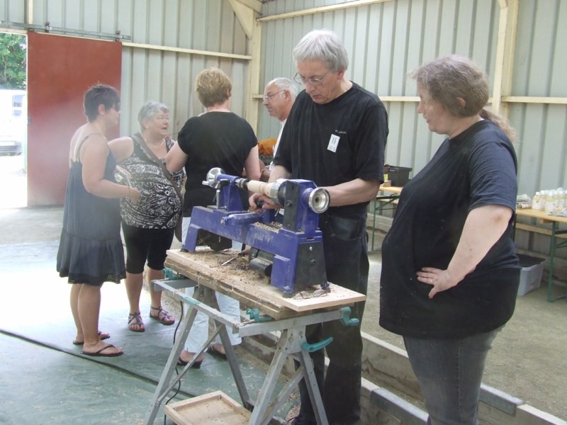 Samedi 26 juin : c'était la dernière journée de travail de la saison 2009-2010 avec la participation de plus de 30 personnes en moyenne sur la journée. En plus de quelques personnes venues du Finitère et de la Sarthe, l'Association recevait aussi Albert PENRU de l'association des Passionnés du bois du Finistère et André-Michel VION. Albert nous a fait découvrir le filetage sur des boites avec couvercle ; André-Michel VION aussi exercé ses talents devant les adhérents très attentifs.