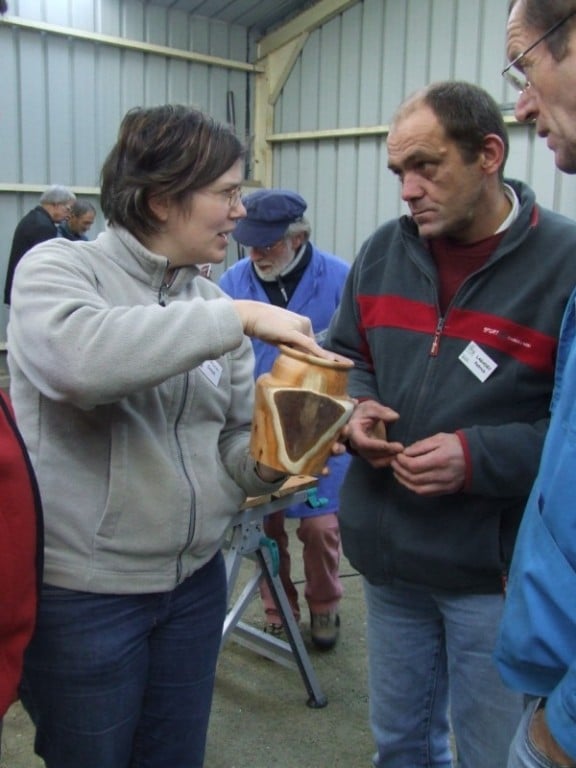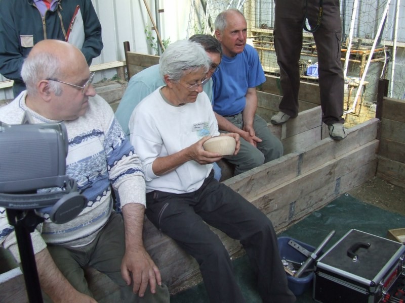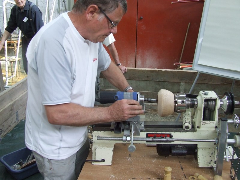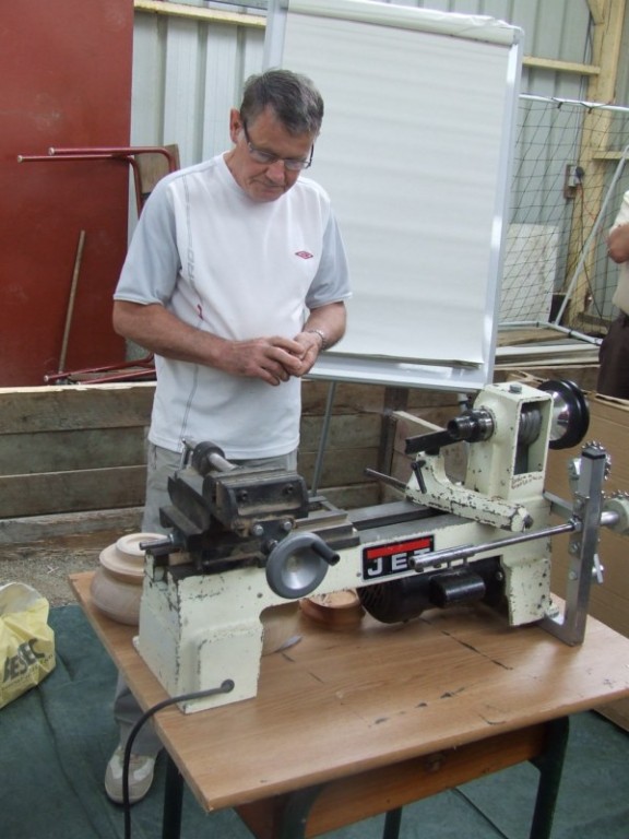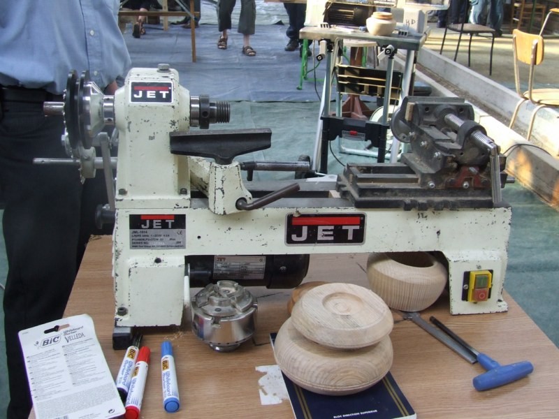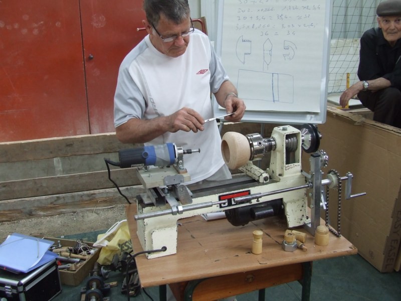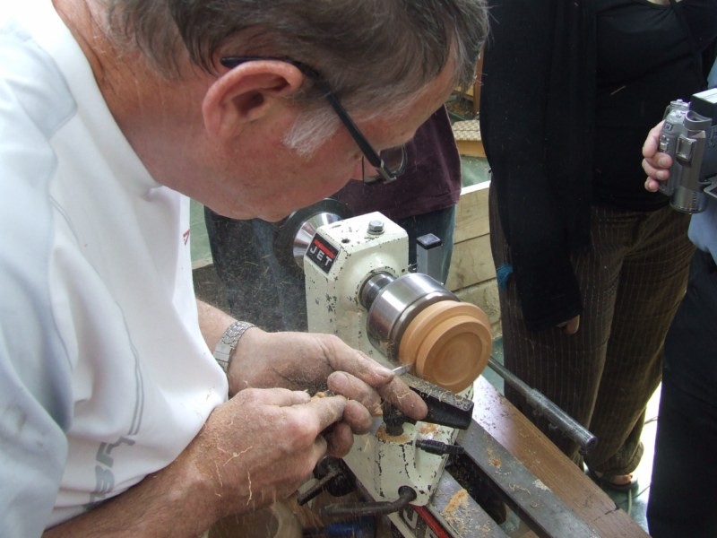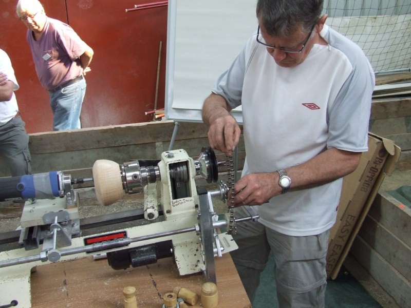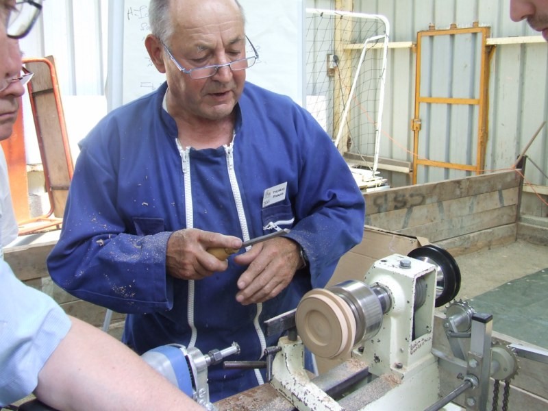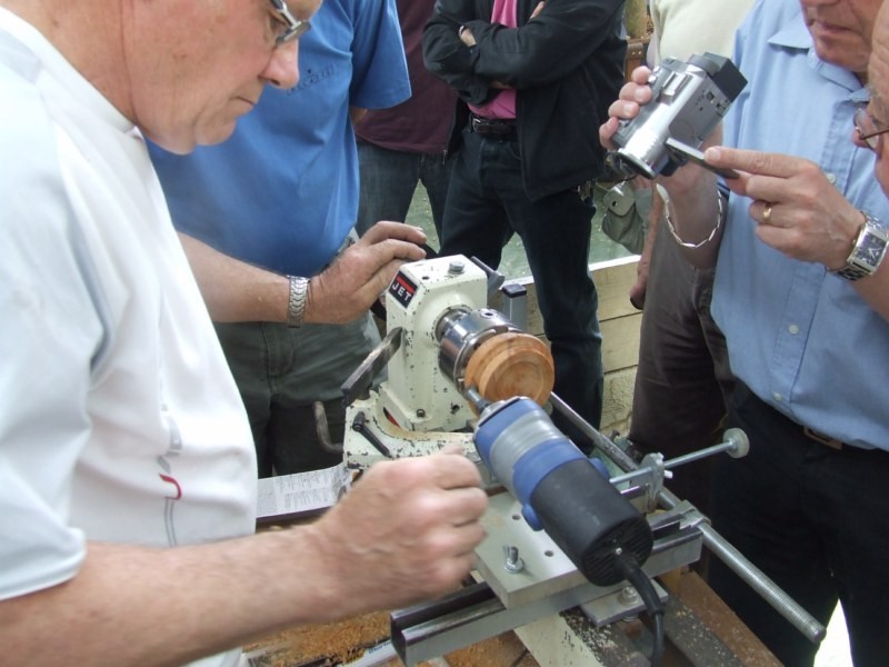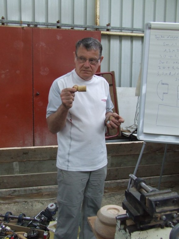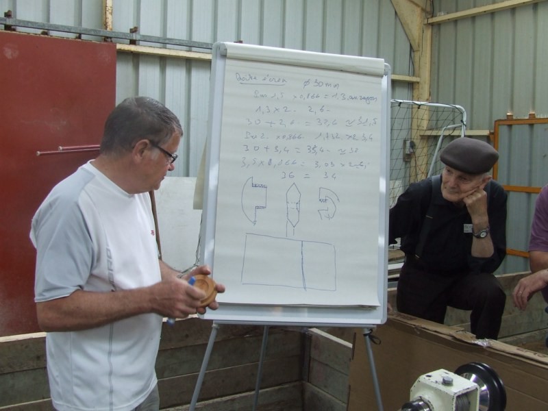 Samedi 26 juin : c'était la dernière journée de travail de la saison 2009-2010 avec la participation de plus de 30 personnes en moyenne sur la journée. En plus de quelques personnes venues du Finitère et de la Sarthe, l'Association recevait aussi Albert PENRU de l'association des Passionnés du bois du Finistère et André-Michel VION. Albert nous a fait découvrir le filetage sur des boites avec couvercle ; André-Michel VION aussi exercé ses talents devant les adhérents très attentifs.