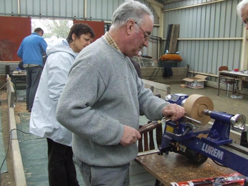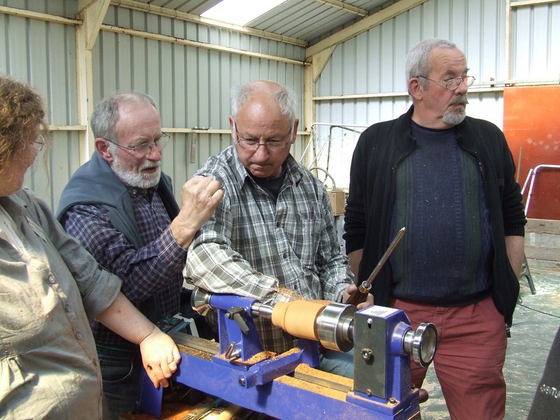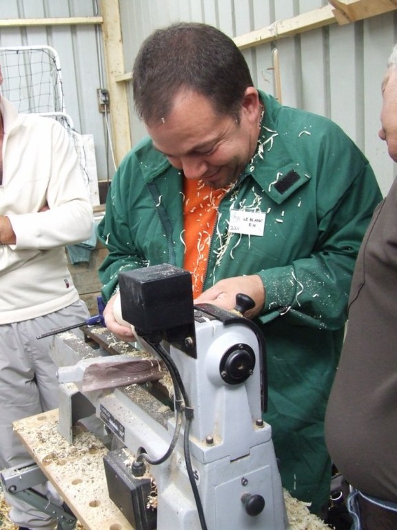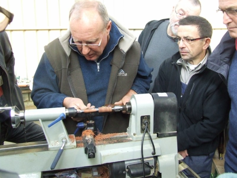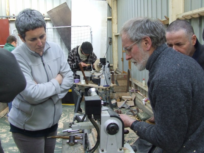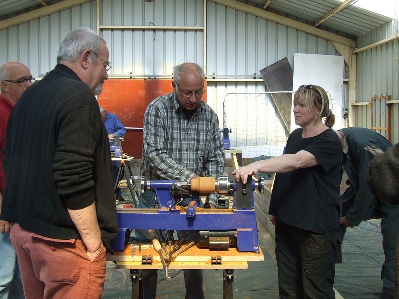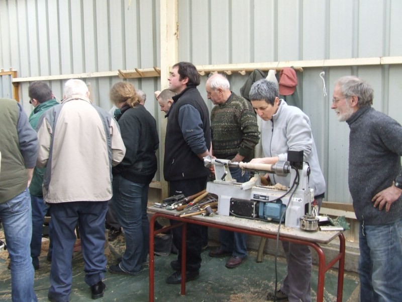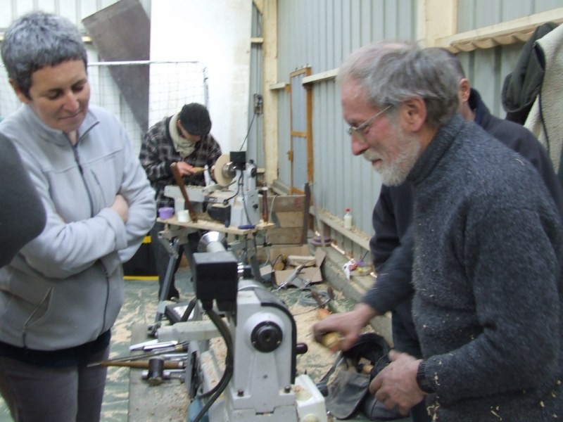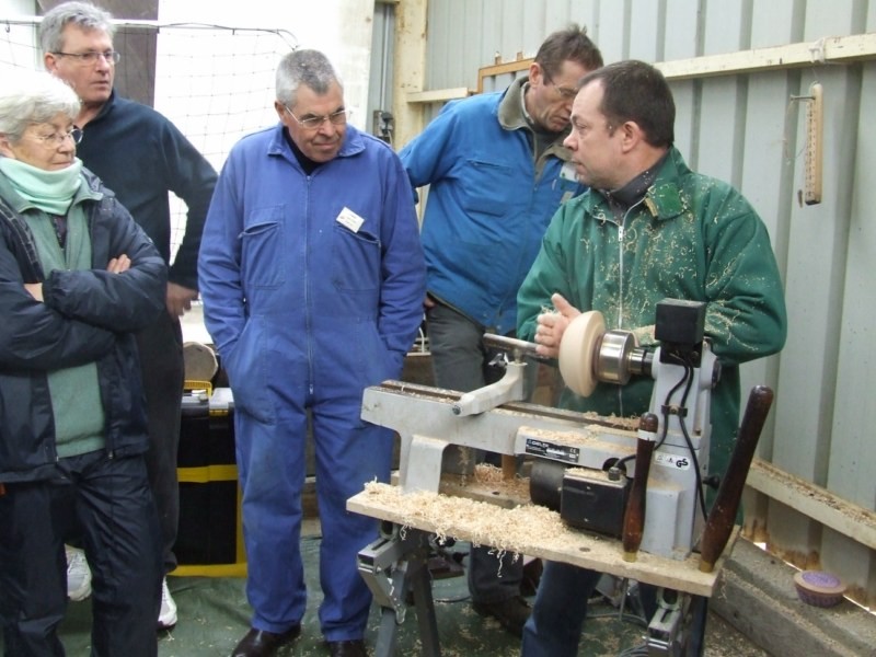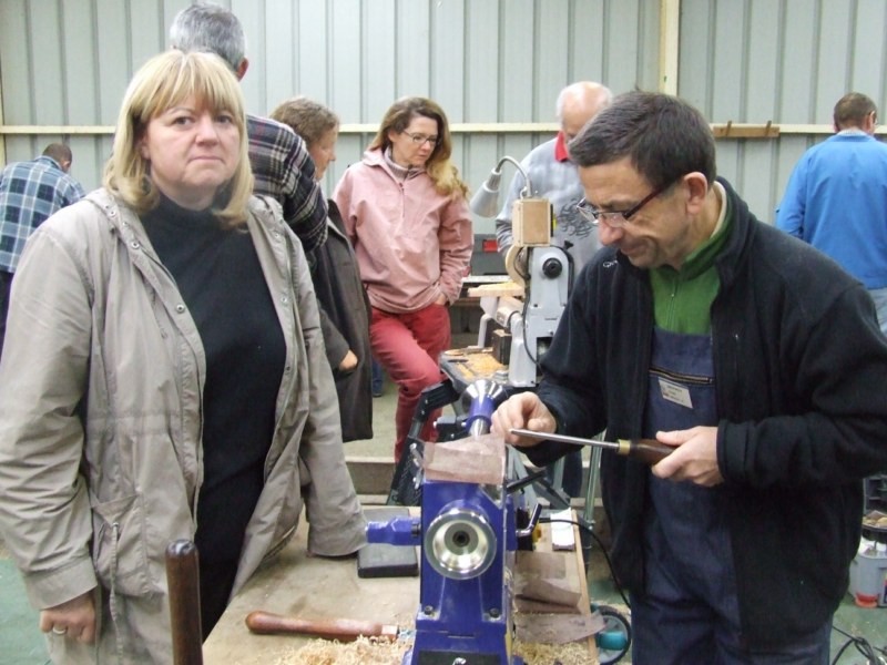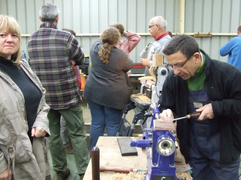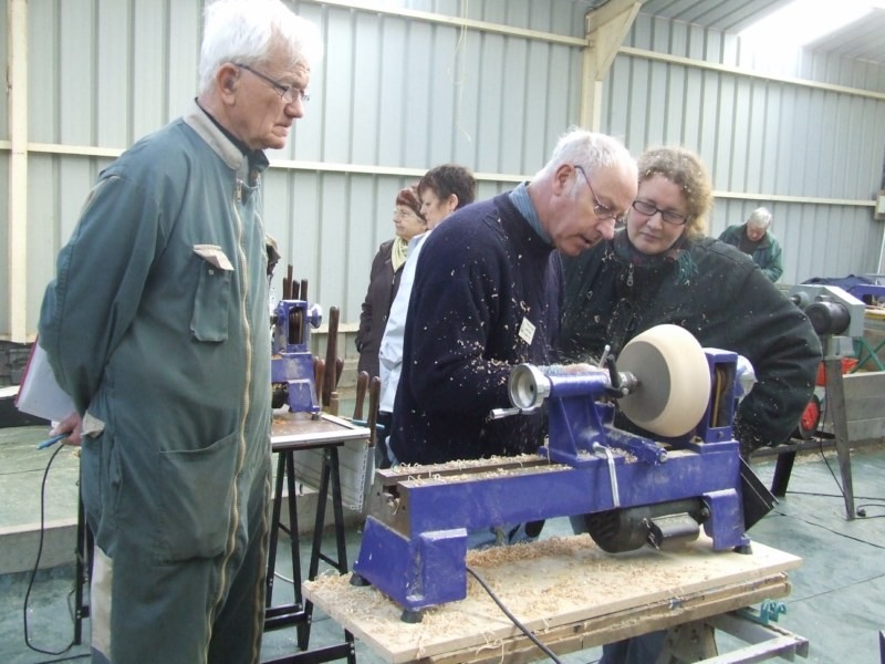 Quelques personnes dont une femme sont venues découvrir le tournage de bois, Michel MORVAN s'est chargé de les initier avec toute la patience qu'on lui connait.
