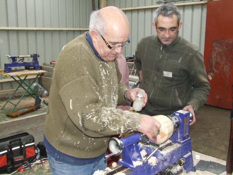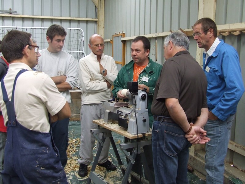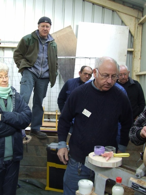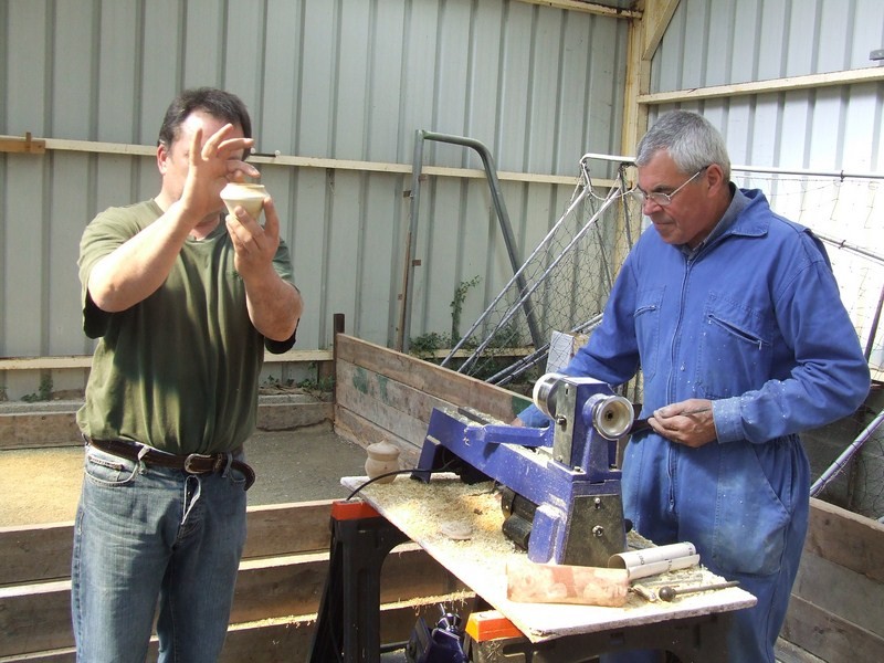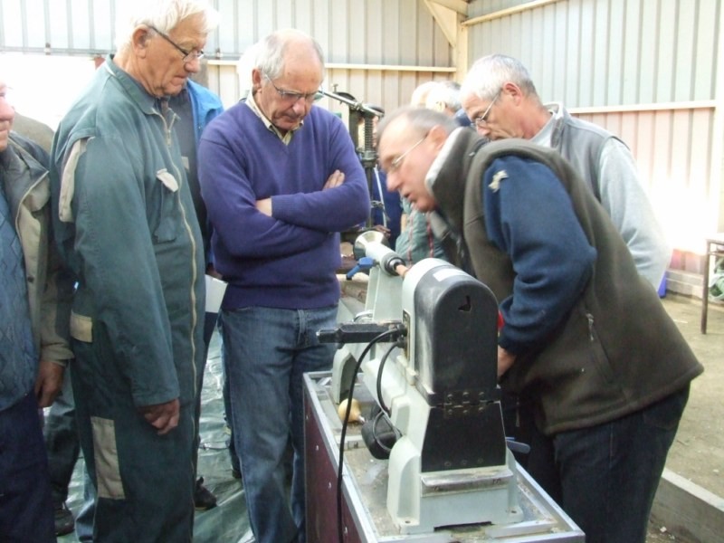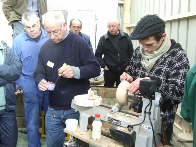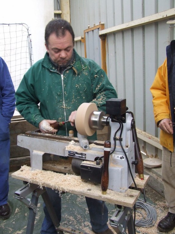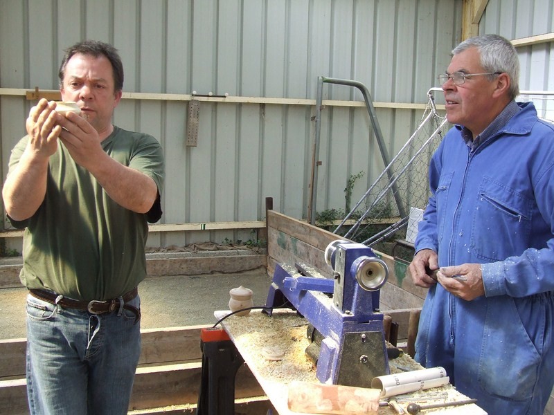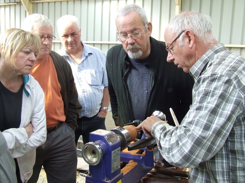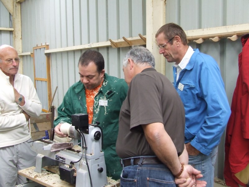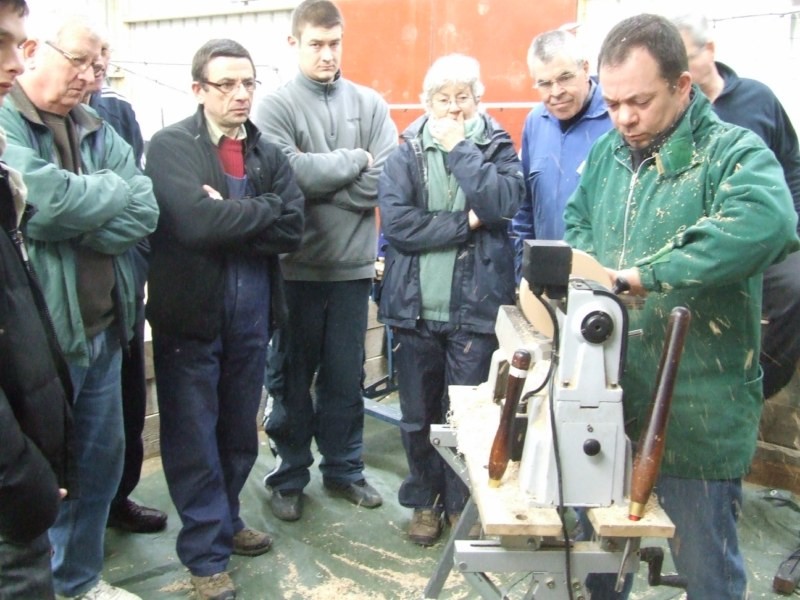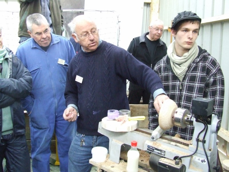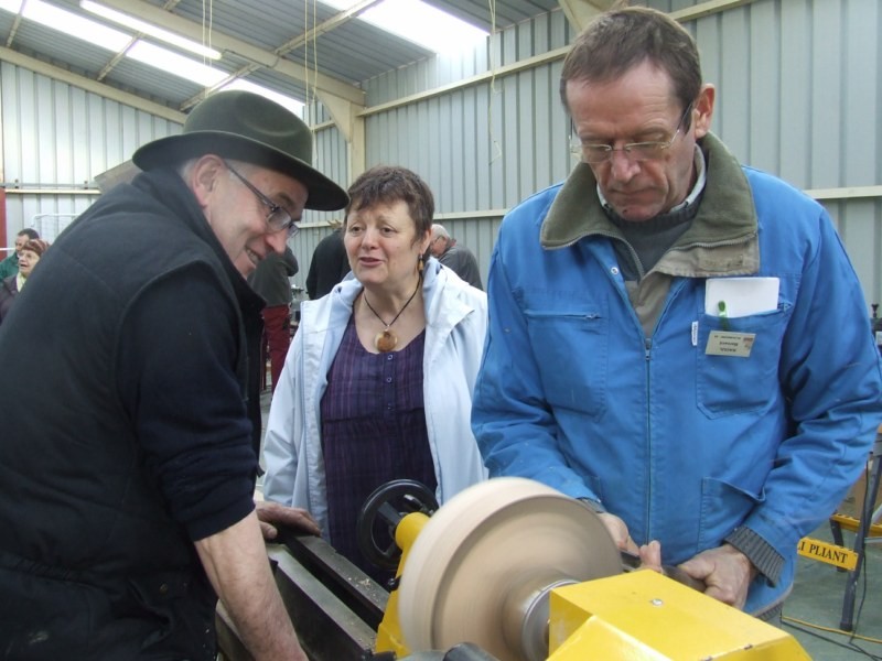 Quelques personnes dont une femme sont venues découvrir le tournage de bois, Michel MORVAN s'est chargé de les initier avec toute la patience qu'on lui connait.