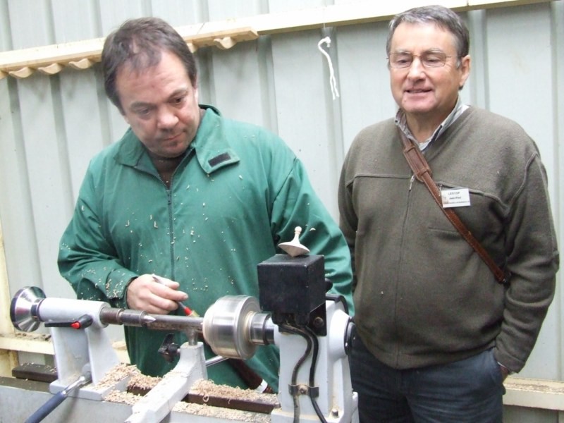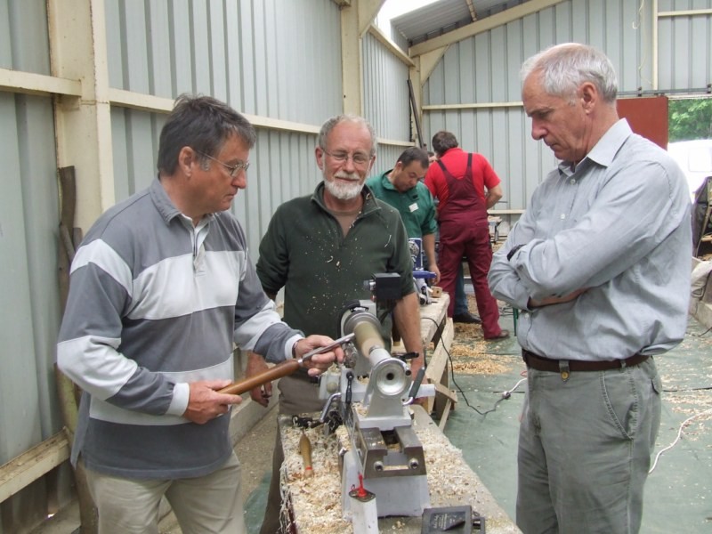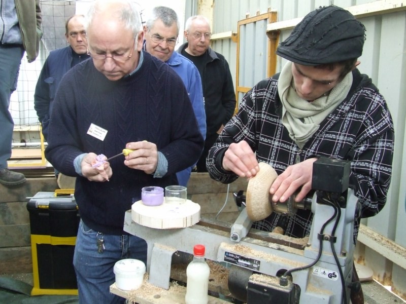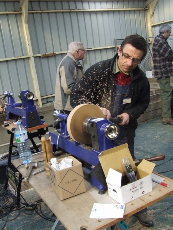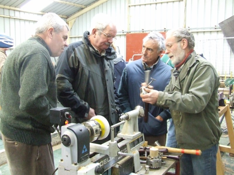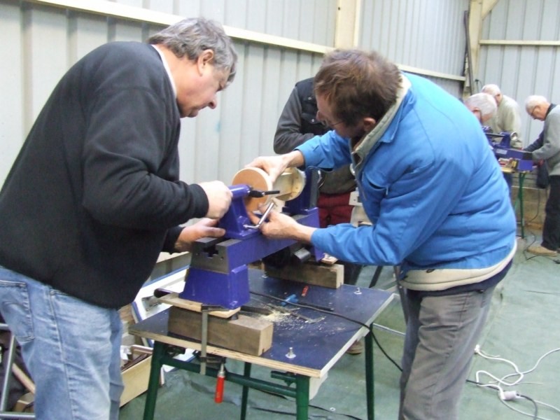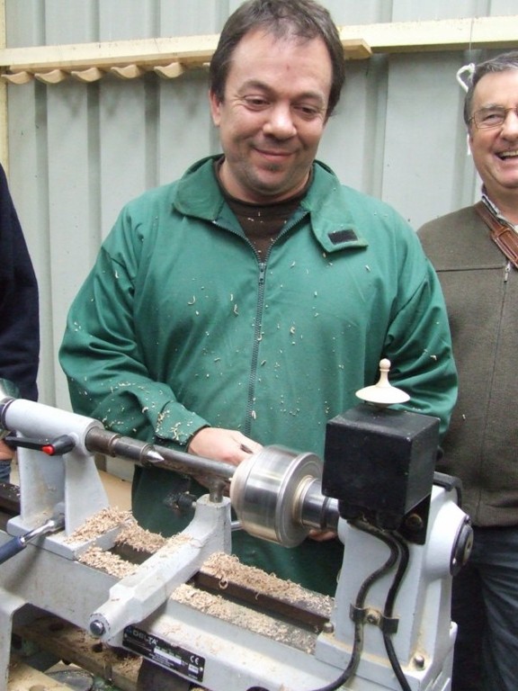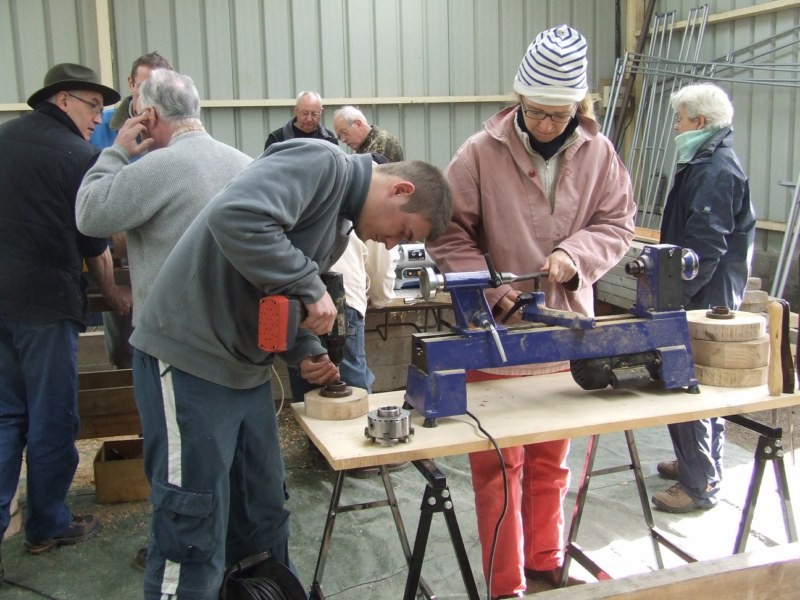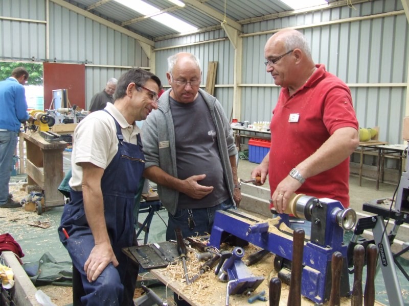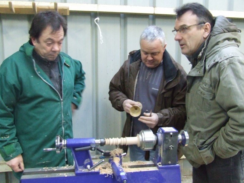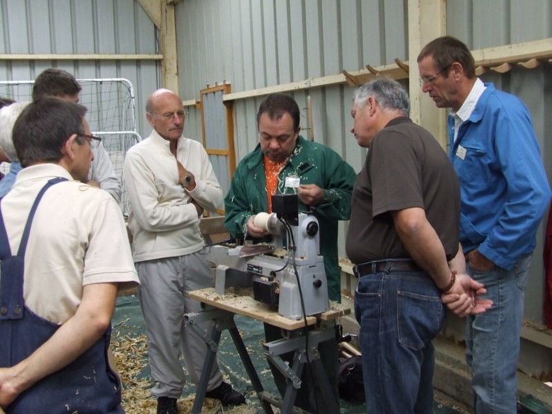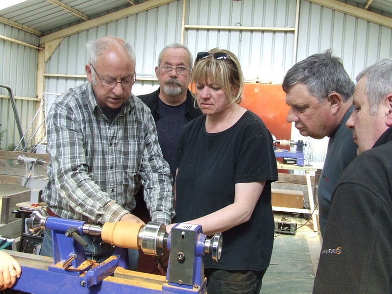 Quelques personnes dont une femme sont venues découvrir le tournage de bois, Michel MORVAN s'est chargé de les initier avec toute la patience qu'on lui connait.