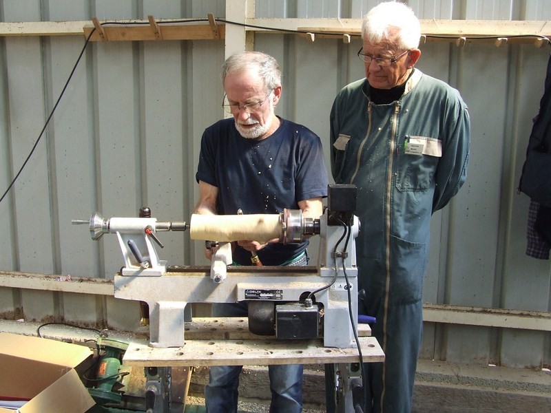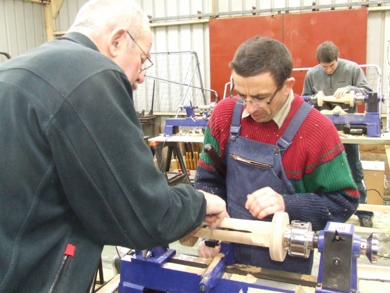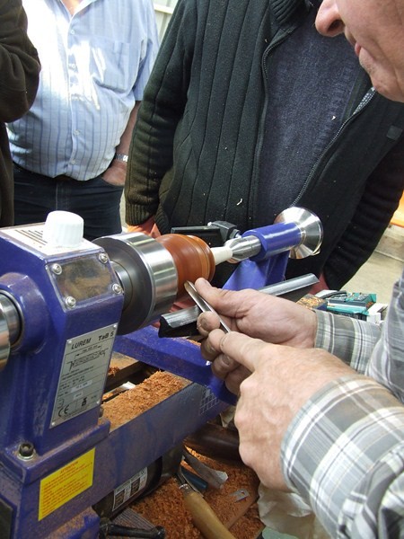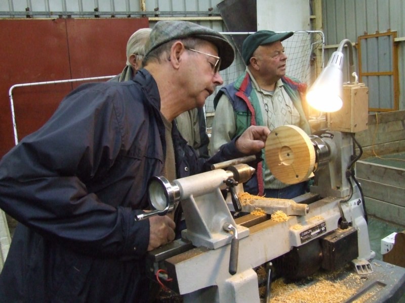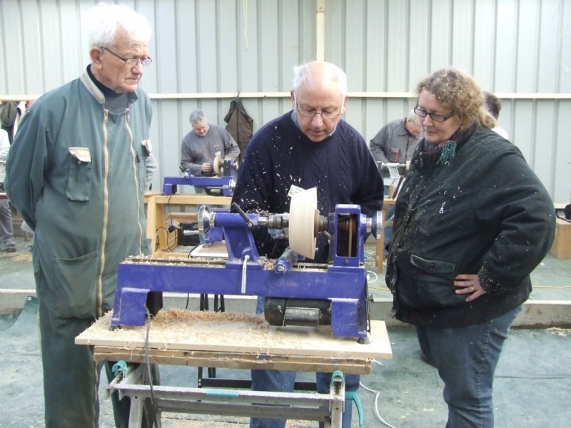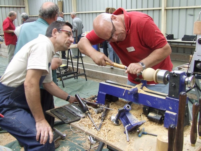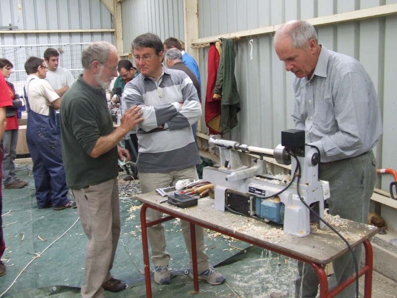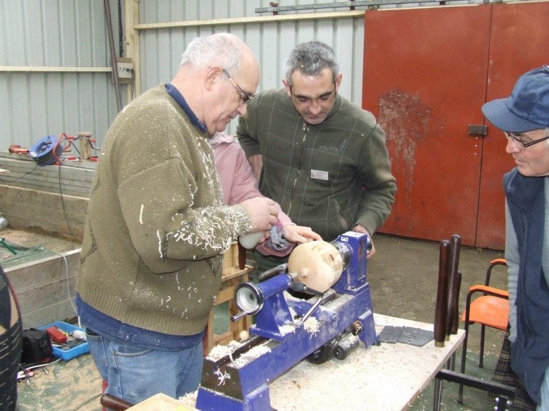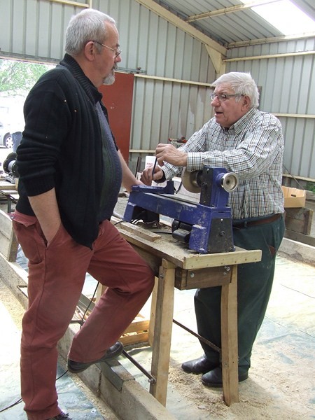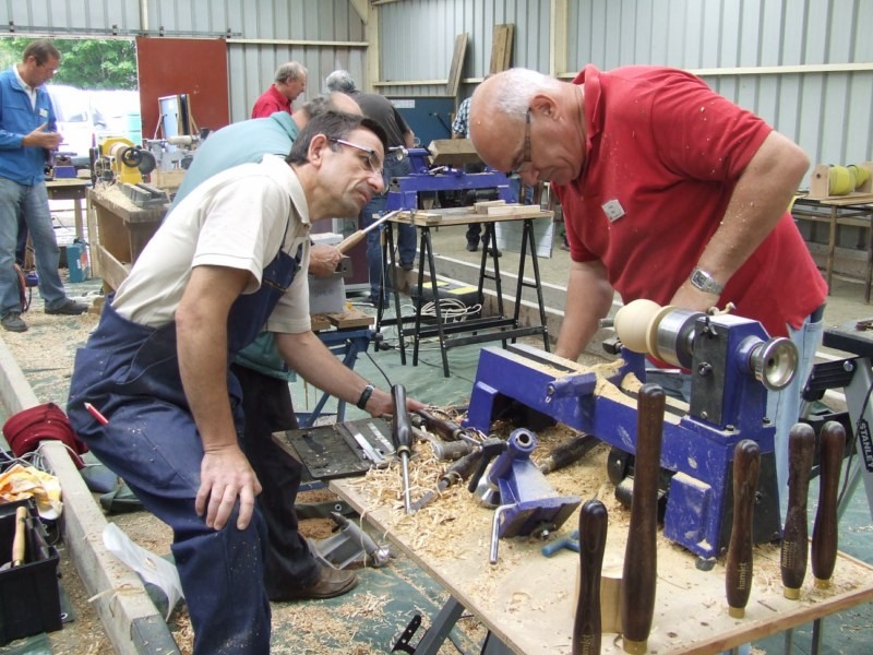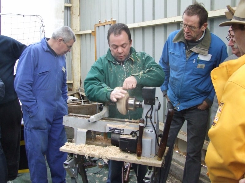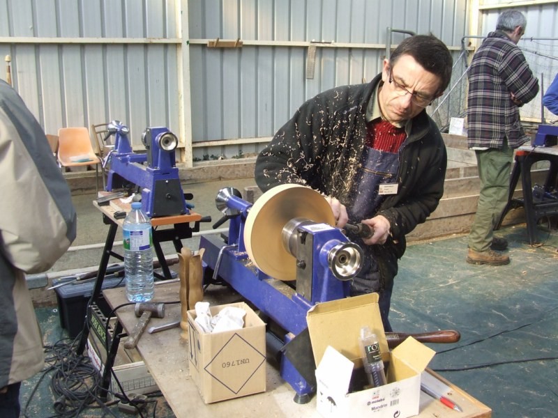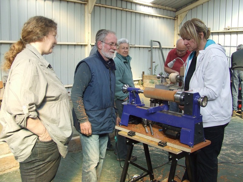 Quelques personnes dont une femme sont venues découvrir le tournage de bois, Michel MORVAN s'est chargé de les initier avec toute la patience qu'on lui connait.