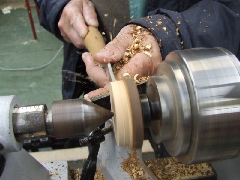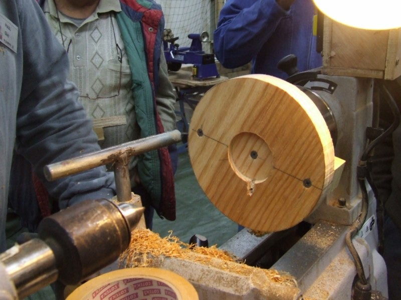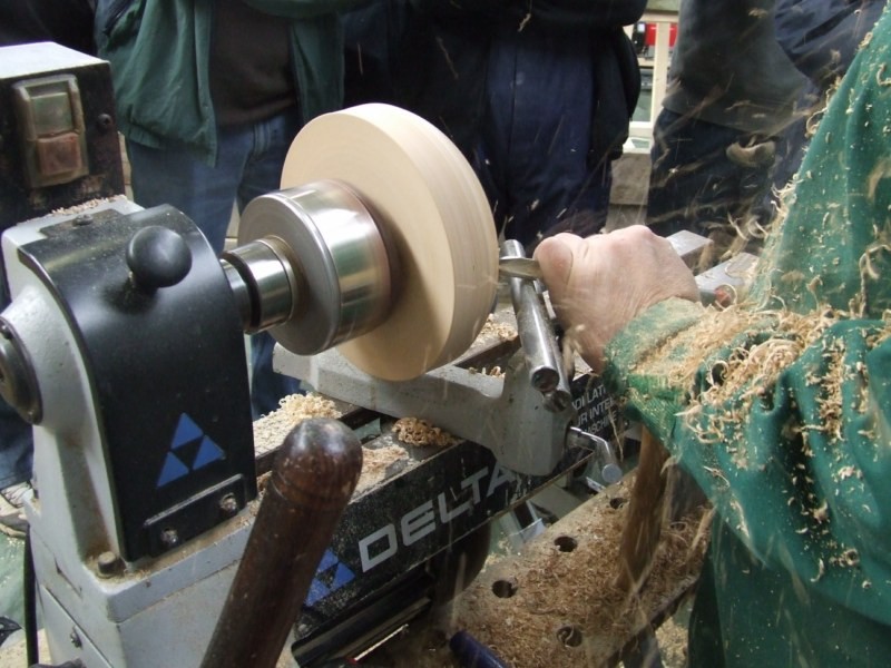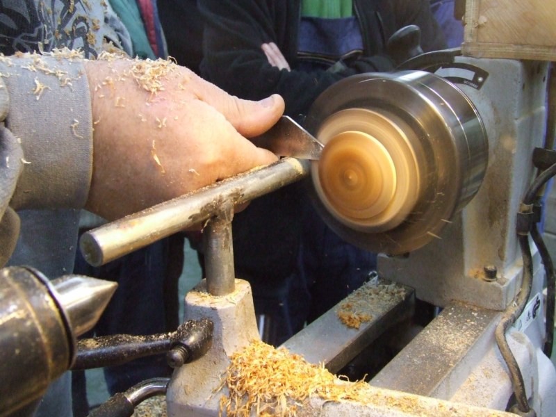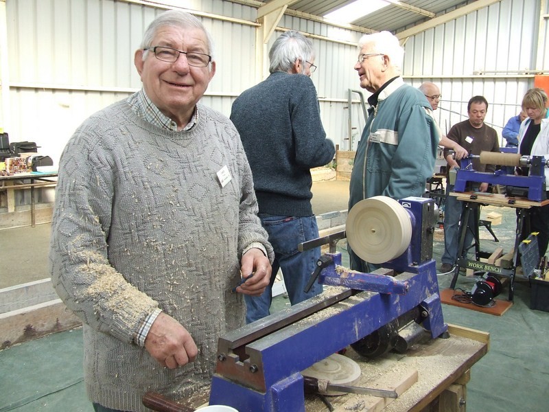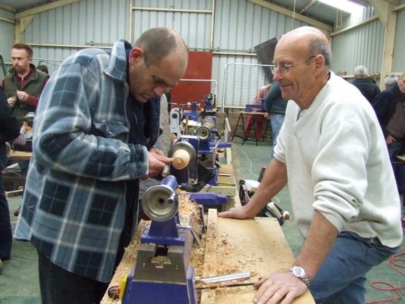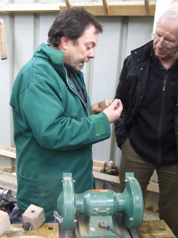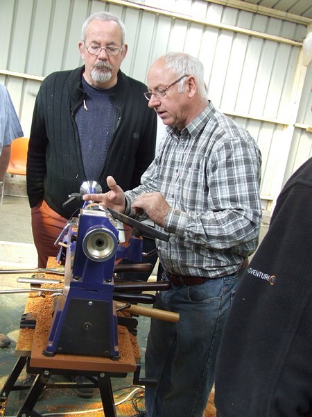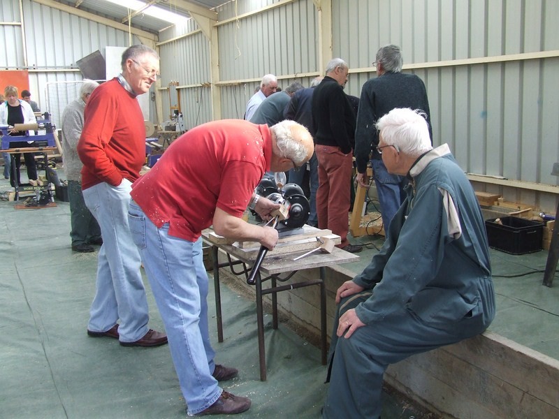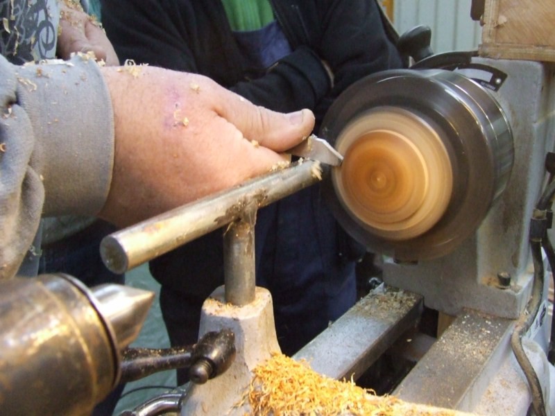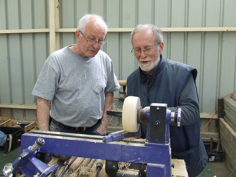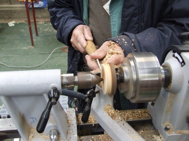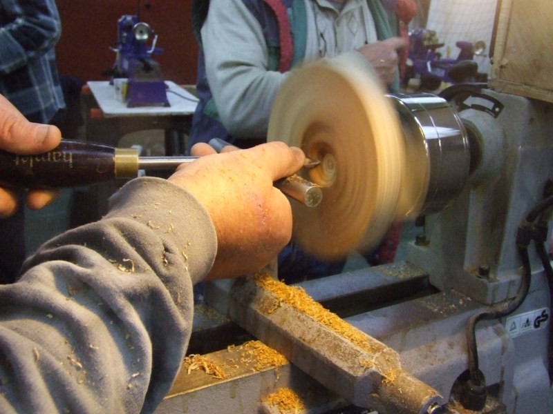 Quelques personnes dont une femme sont venues découvrir le tournage de bois, Michel MORVAN s'est chargé de les initier avec toute la patience qu'on lui connait.
