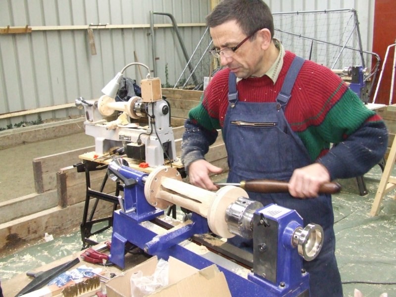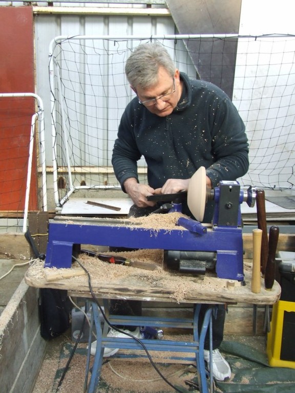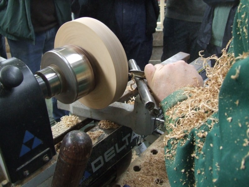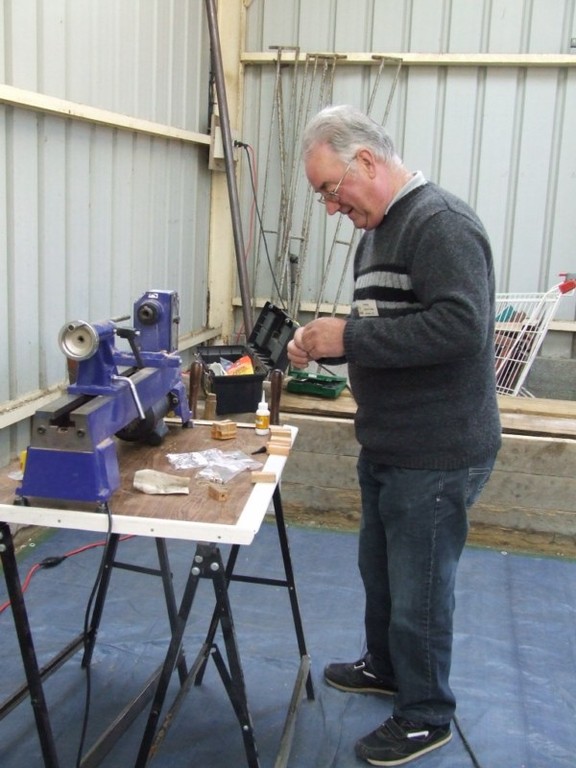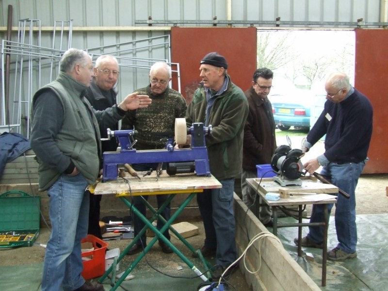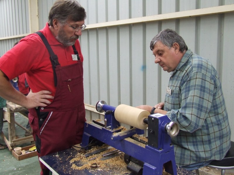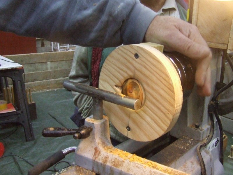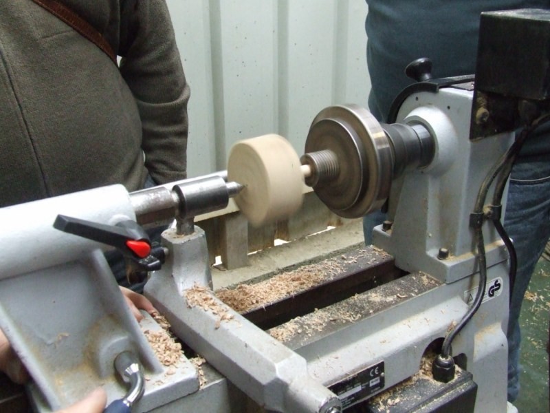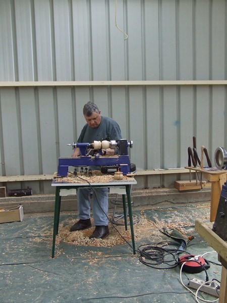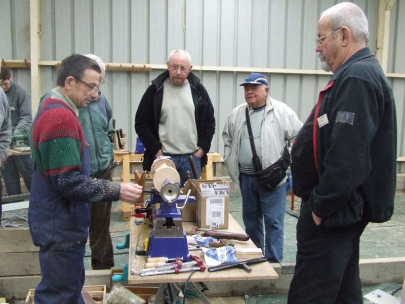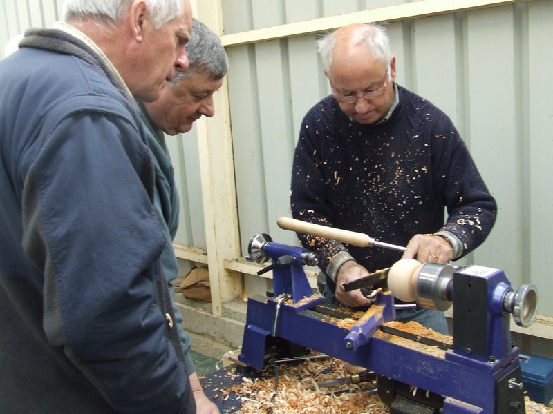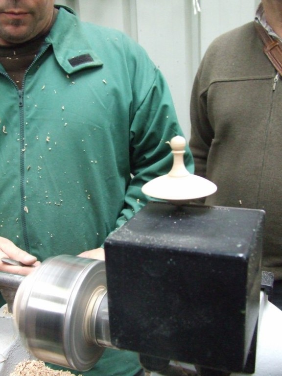 Quelques personnes dont une femme sont venues découvrir le tournage de bois, Michel MORVAN s'est chargé de les initier avec toute la patience qu'on lui connait.